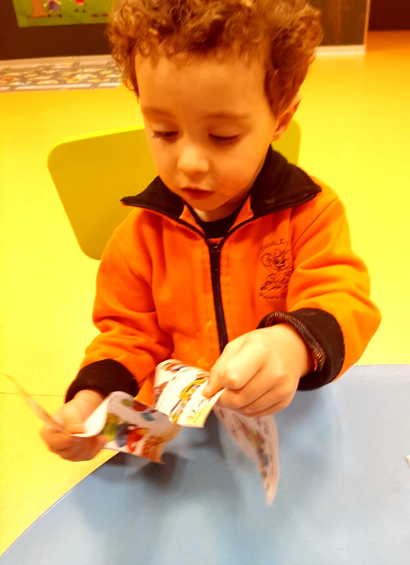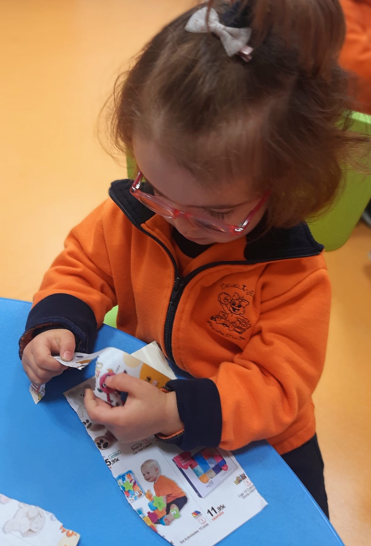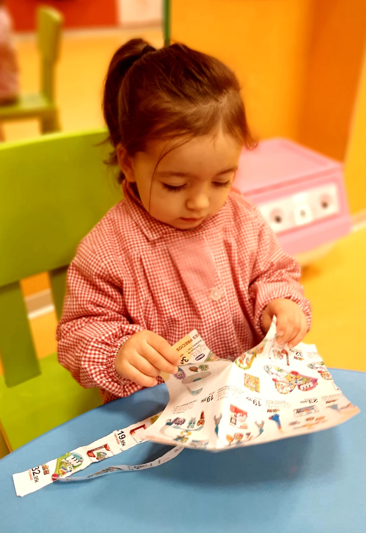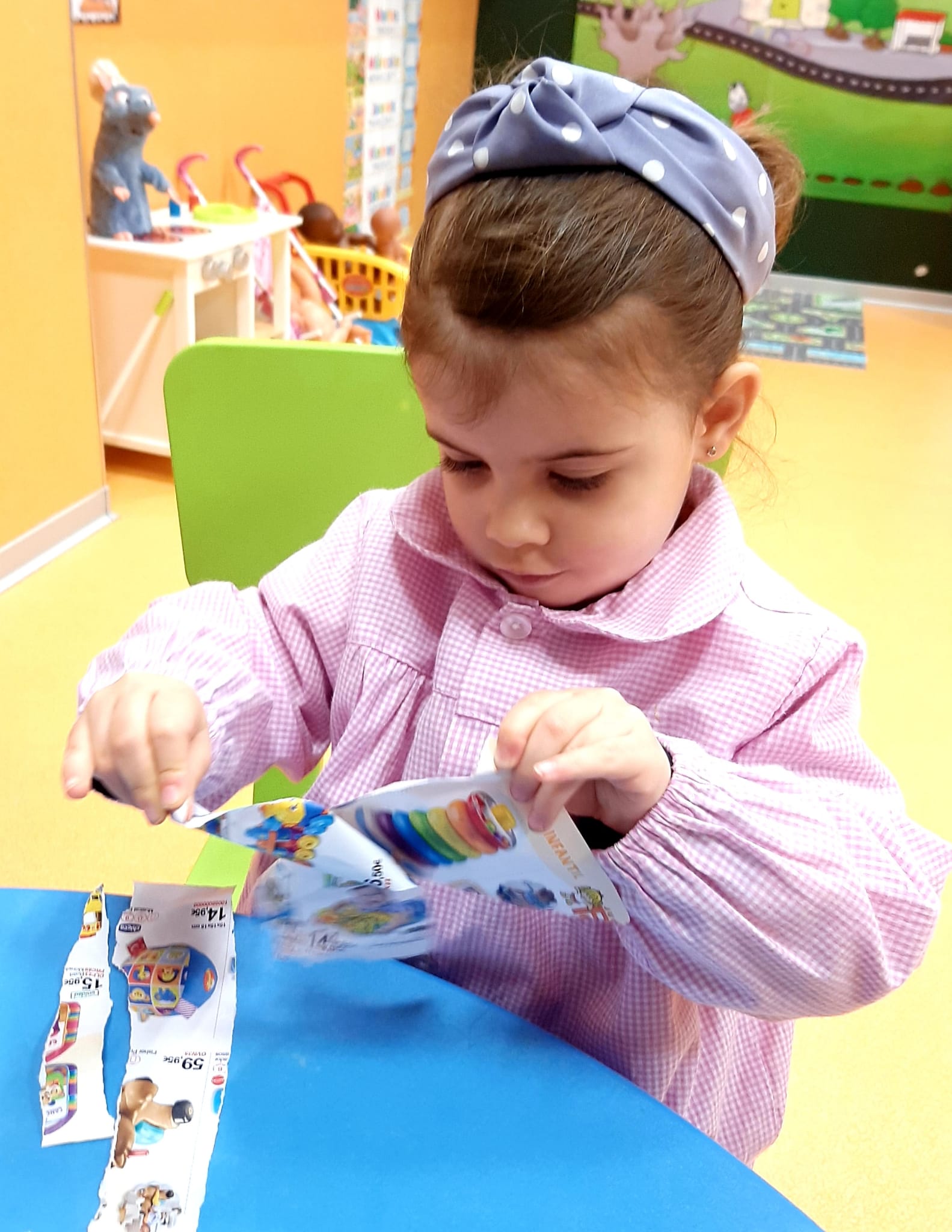 Nosotros estas semanas estamos trabajando las líneas, las figuras geométricas, trabajar con papeles y pegatinas pequeñitas o atarnos los zapatos.